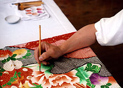 色あせ、色抜け、柄落ちをしている場合はお客様のご希望により色掛け、柄入れを行っております。 金銀粉、金箔が落ちている場合は補修も受け承っております。 紋書きも同様受け承っております。着物クリーニングの特殊工程です。 |